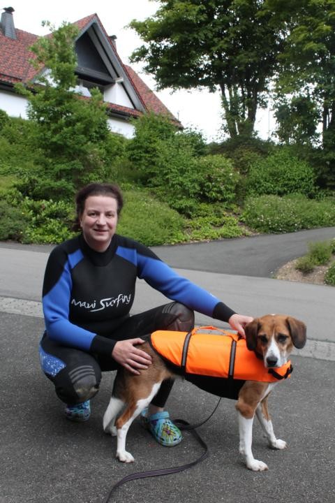 Im Moment findet das schwimmen in einem extra mit Lauframpe ausgestatteten Aussenpool mit 3,66m Durchmesser statt.